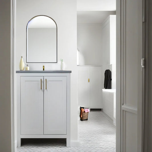 24-inch bathroom wooden cabinet finished in fog grey with Quartz top and sink