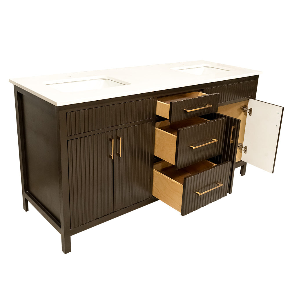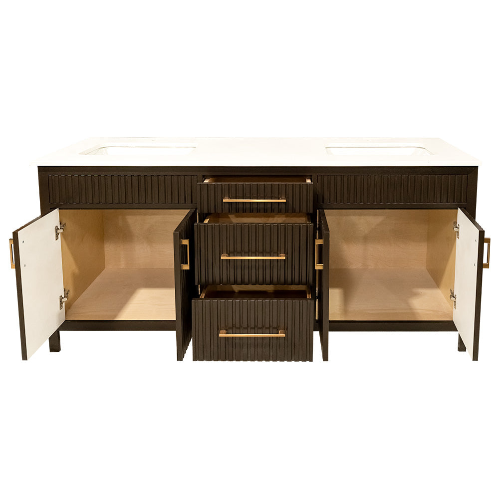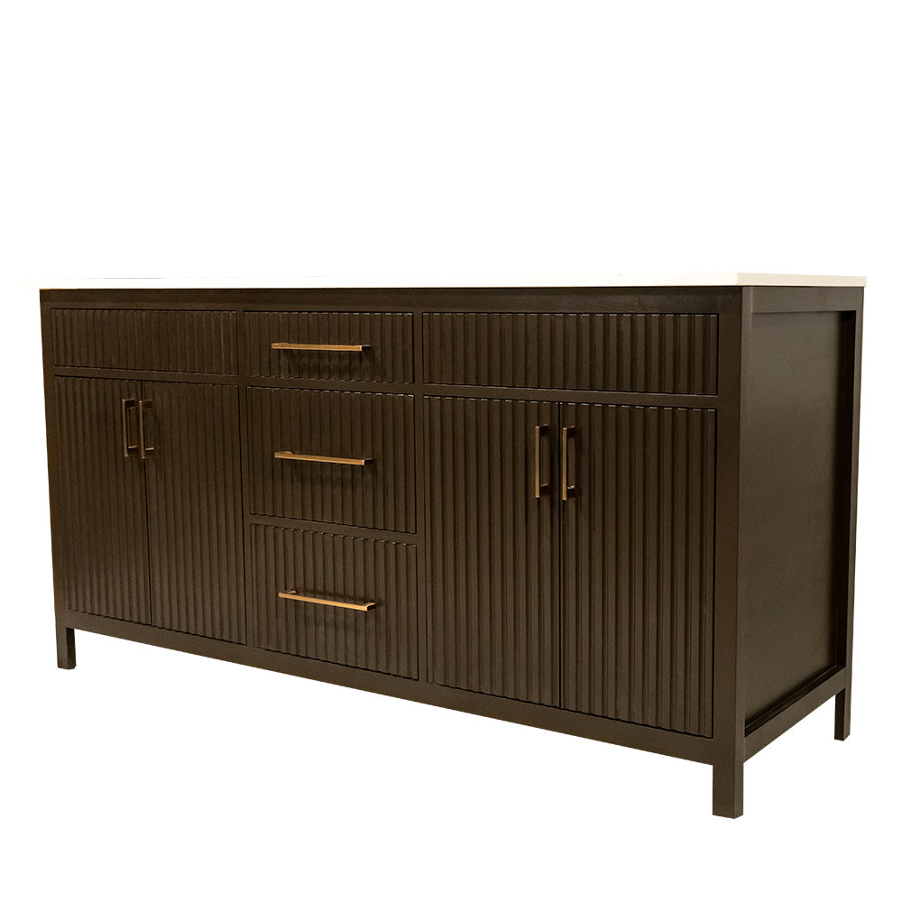 Bittersweet chocolate fluted style wooden vanity double sink with quartz top