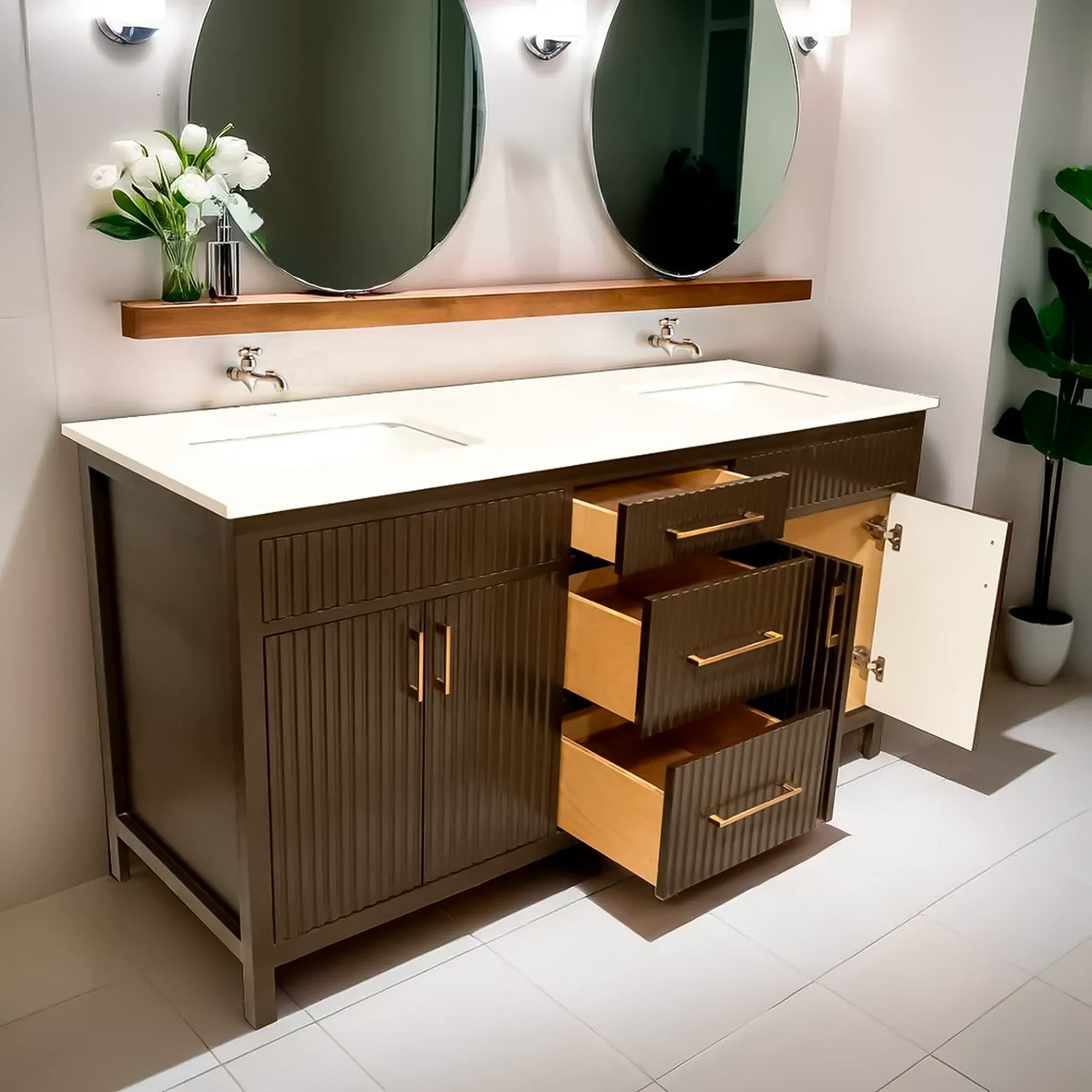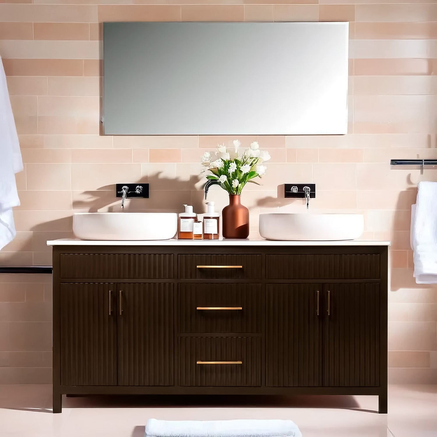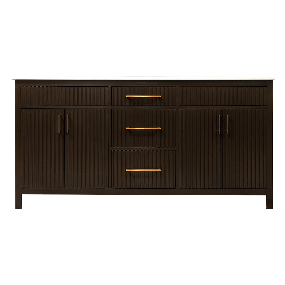 Bittersweet chocolate fluted style wooden vanity double sink with quartz top