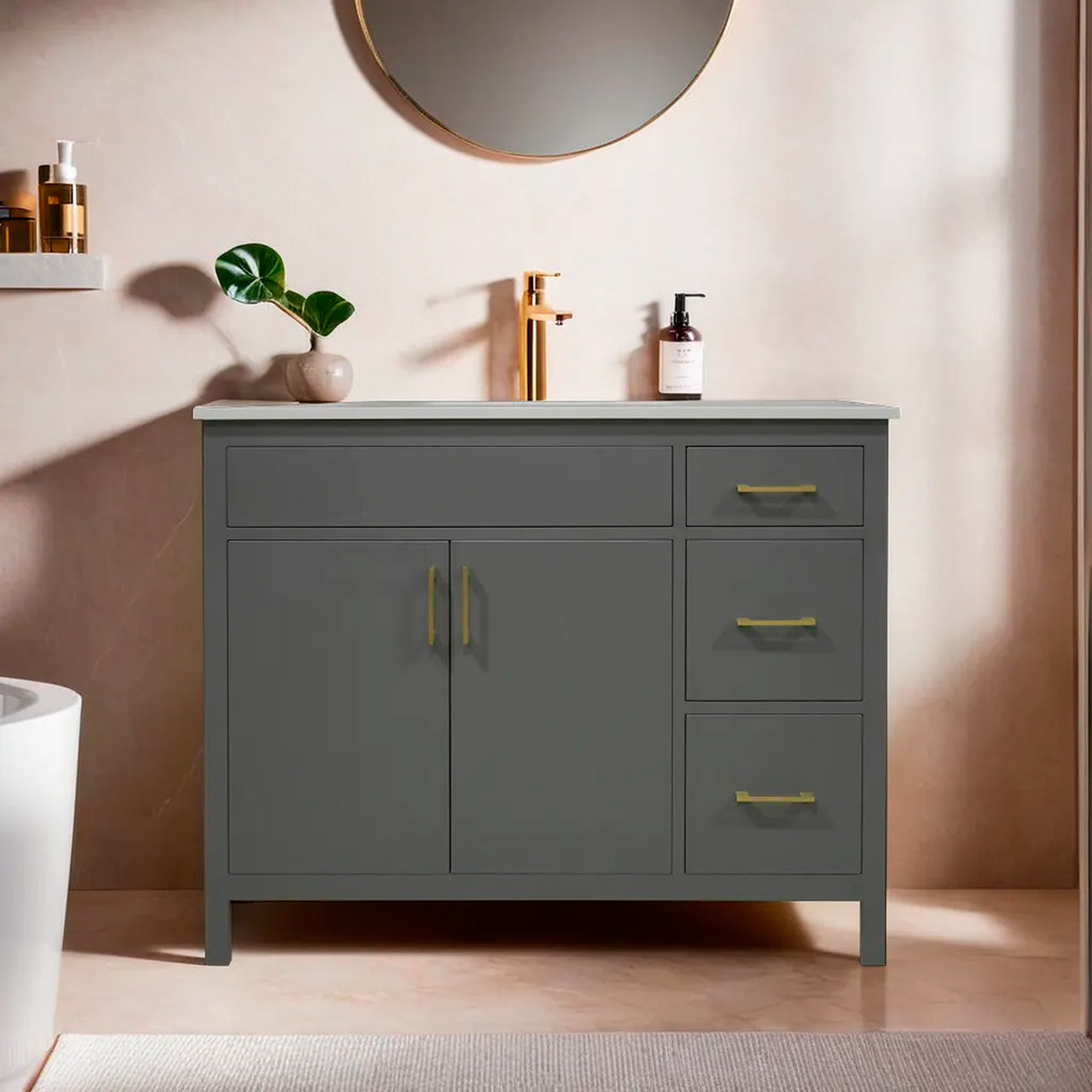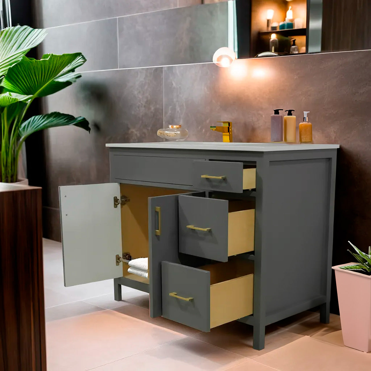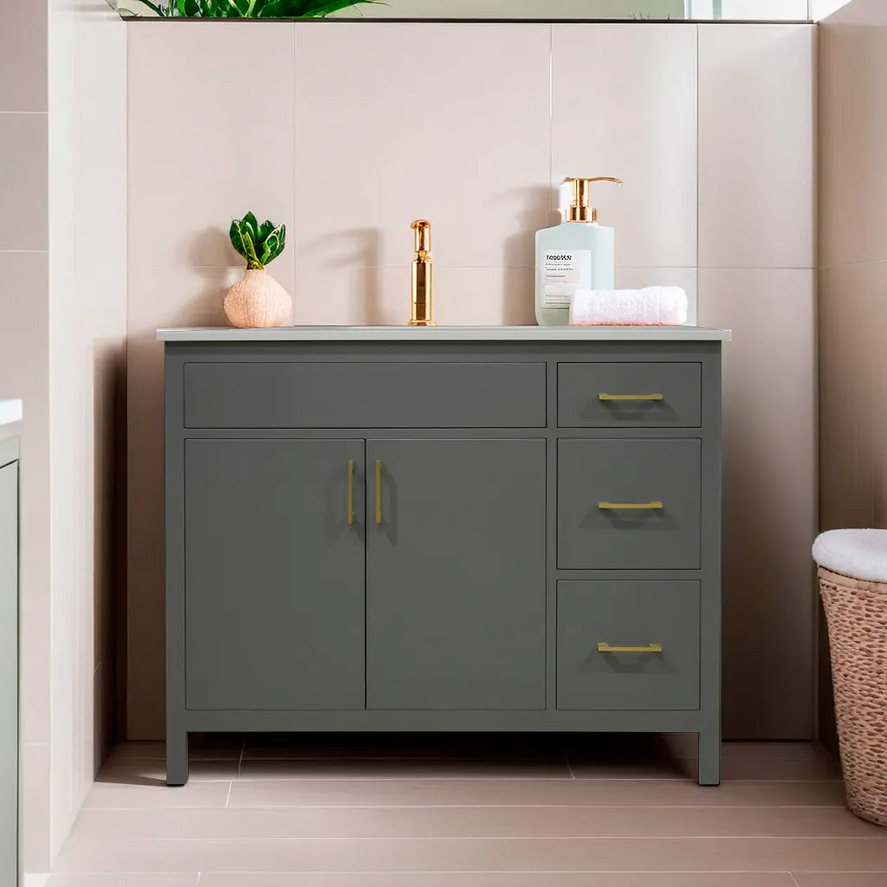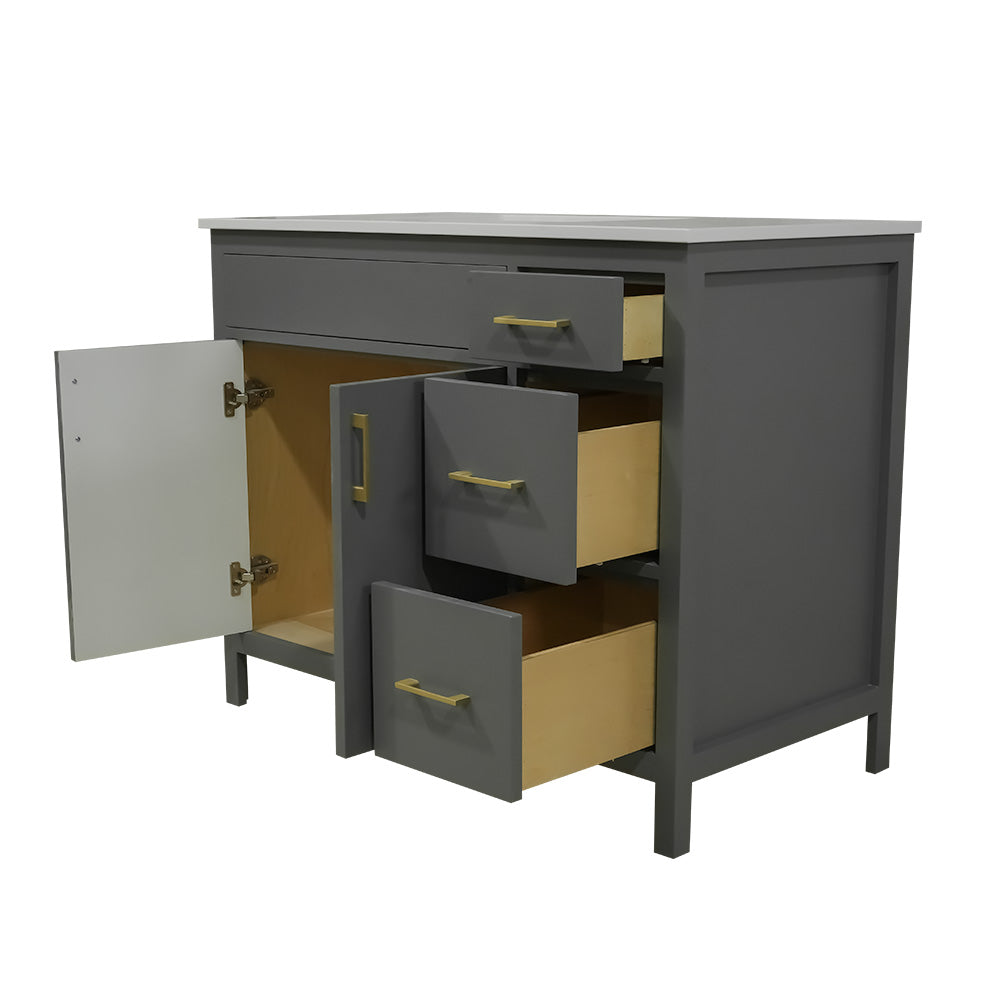 42" wood vanity 2 doors 3 drawers on the right include quartz